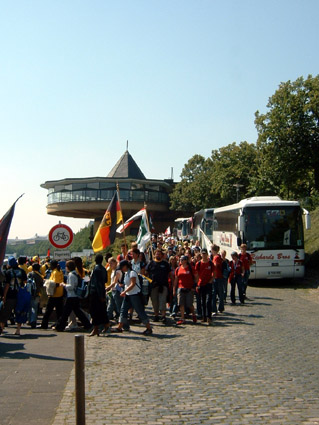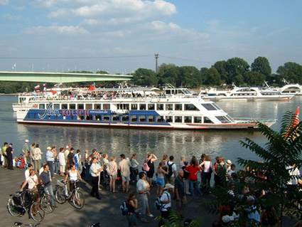 Anläßlich des Weltjugendtages wurden von Busfotografen Bilder der etwa 8000 angereisten Pilger-Busse im Kölner Raum gemacht. Während des Fotografierens erfolgte eine Vorbeifahrt mehrerer Schiffe einer Pilgerprozession. Die Bilder entstammen der Kamera von Jan Ritterstaedt Köln und wurden am 17. August 2005 etwa gegen 12.45 - 12.55 Uhr am Kölner Rheinufer in der Nähe der Bastei gemacht. |