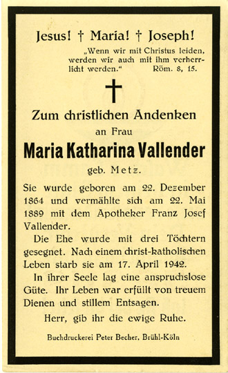 Maria Katharina Vallender , geb. Metz * 22. Dezember 1824 + 17. April 1942