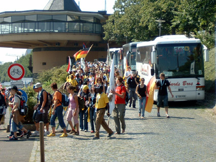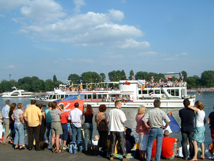 Anläßlich des Weltjugendtages wurden von Busfotografen Bilder der etwa 8000 angereisten Pilger-Busse im Kölner Raum gemacht. Während des Fotografierens erfolgte eine Vorbeifahrt mehrerer Schiffe einer Pilgerprozession. Die Bilder entstammen der Kamera von Jan Ritterstaedt Köln und wurden am 17. August 2005 etwa gegen 12.45 - 12.55 Uhr am Kölner Rheinufer in der Nähe der Bastei gemacht. |